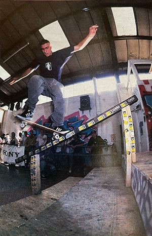 Guy’s first published photo appeared in a Powell Peralta zine. Frontside wallride frontside grab next to frontside boardslides from Gabriel Rodriguez and Paulo Diaz