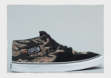 Our newest Half Cab is a Tiger cam colourway. It has a black toe area and a durable mixed canvas with a repeating tiger camo print throughout. These have a white outsole and a trusty waffle sole unit. We have the classic SK8-Hi Reissue in a Vintage Tibet colourway which is a deep red. This has the original high top construction, a suede upper and high canvas sidewalls finished off with a white side stripe and outsole aboard a waffle sole. Our newest Half Cab Pro is the Blackout colour. This Half Cab Pro as always has advanced cushioning and increased durability. This stealthy all black number is made of super tough synthetic nubuck, the only break in this colour code is a red Vans heel tab. We received two regular Sk8-HI’s, one is True White and the other is Navy. There is a new TNT 5 in Black/Charcoal. Tony Trujillo’s pro shoe is the best it has ever been. It has a Co-Molded PU3 footbed with Impactsorb designed to eliminate the heel bruise factor without losing any boardfeel. It has a black upper with a grey side stripe and a dark gum outsole.